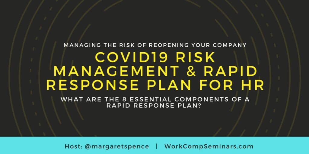 It may seem that COVID19 has gone away (will go away) but medical experts tell us COVID19 will be here for at least another 12 – 18 months a critical reason why your organization needs a COVID19 Risk Management Rapid Response Plan. This course will guide HR Managers to build a proactive Risk Management Plan that addresses HR Policies, Risk Management, Employee Safety, Workers’ Compensation while developing a COVID19 Pandemic Rapid Response Plan.